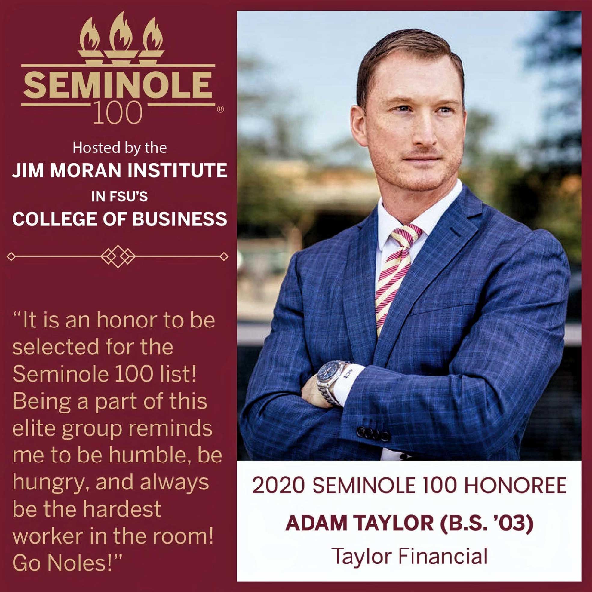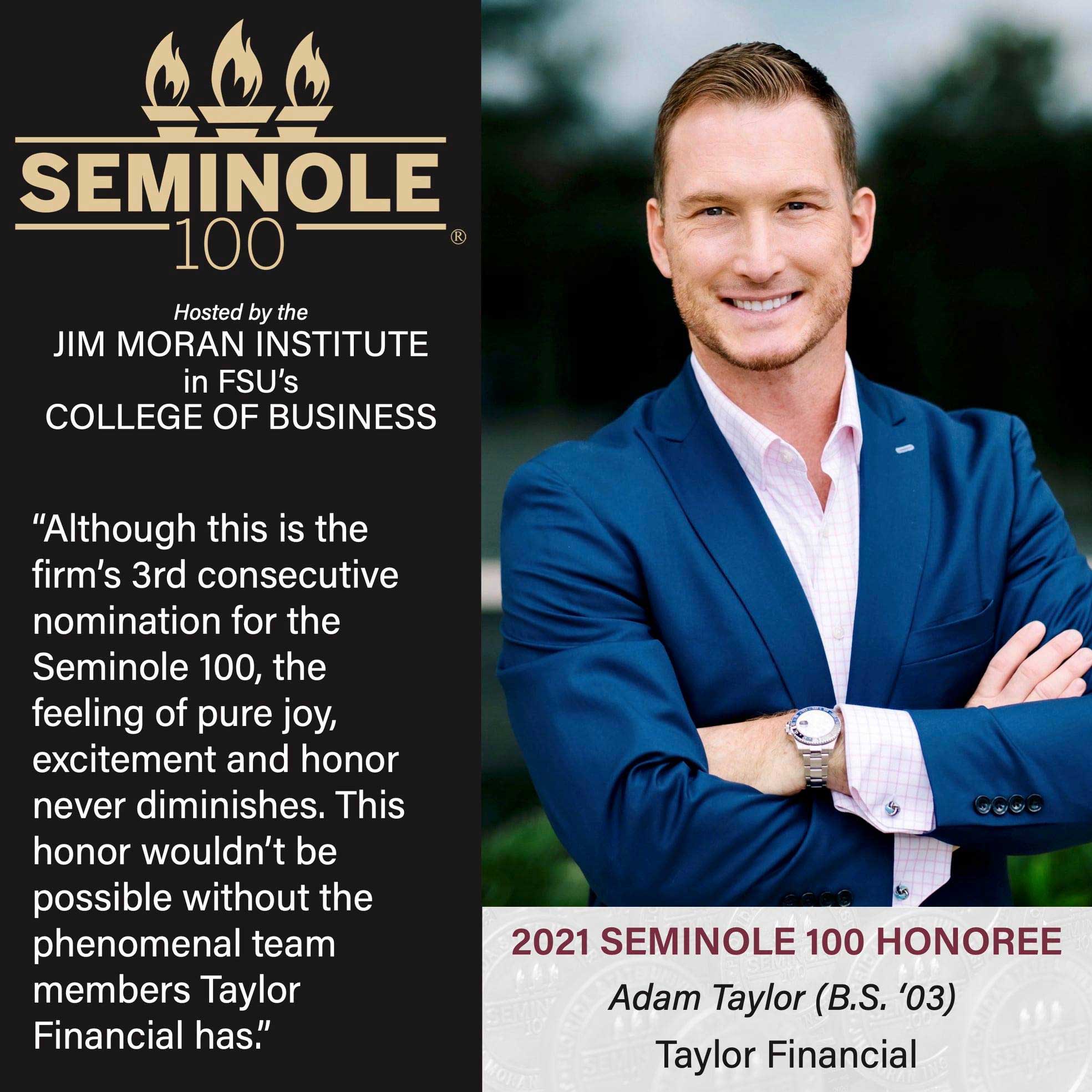 In 2021, Adam was nominated as a 40 under 40 recipient with the Greater Tampa Bay chamber. In the same year, Taylor Financial was awarded for the 6th year in a row the Seminole 100 award and finished #16. The award recognizes the 100 fastest-growing businesses in the nation owned by Florida State Alumni. Adam has also been featured in Forbes, USA Today, Nasdaq News, LA Weekly, NY Weekly, Digital Journal, CBS – Great Day Live, and ABC – Morning Blend. In 2024, Adam’s achievements were further recognized when Forbes named him one of the top 100 advisors in Florida.