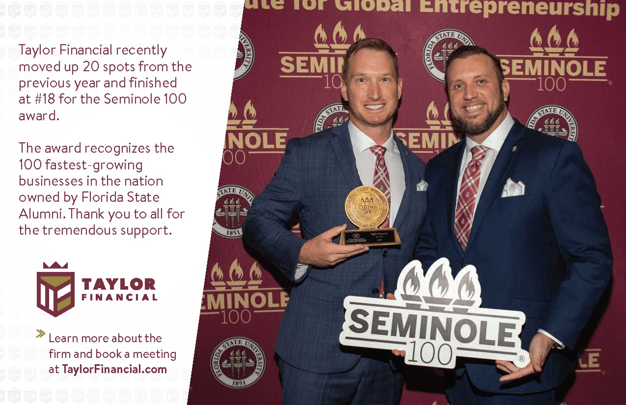 Seminole 100 recognizes the 100 fastest-growing FSU alumni-owned businesses at a celebration on FSU’s campus each year, during which each company learns their numerical ranking and receives their award. This event honors FSU’s entrepreneurs and allows them to share valuable business insights with each other. Honorees and their businesses will also receive increased publicity and visibility via national, local and industry media exposure.